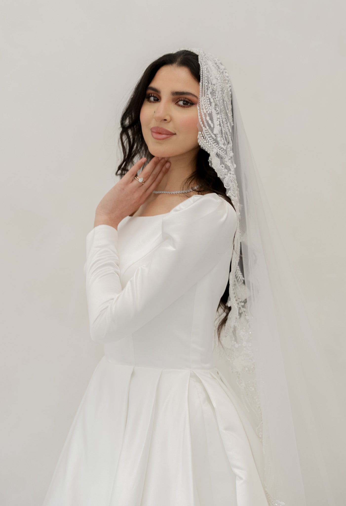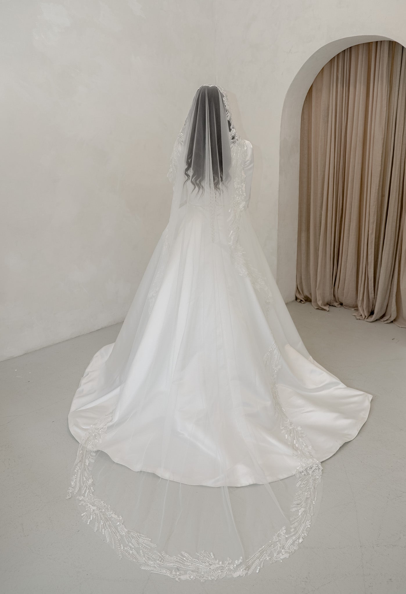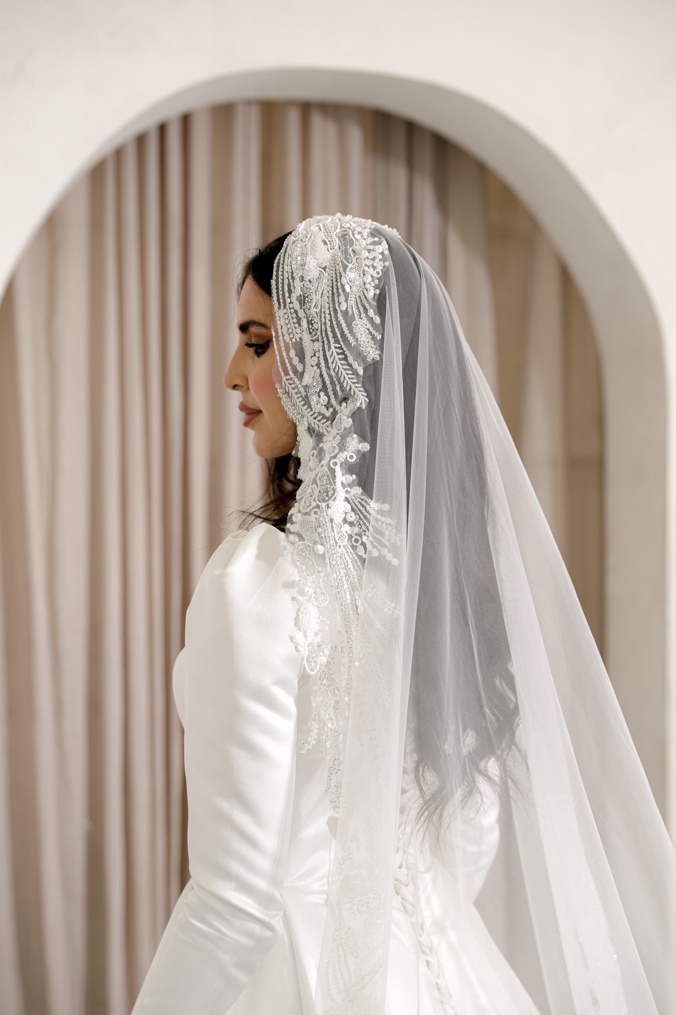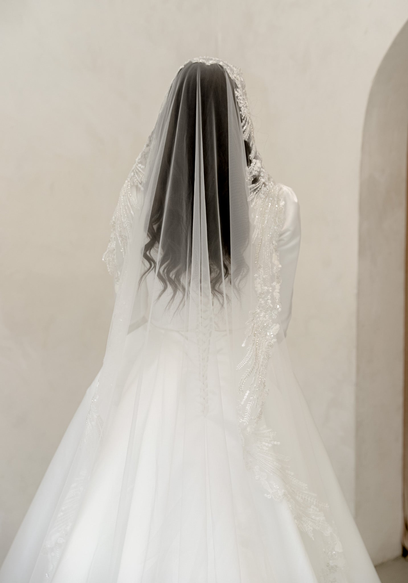 Whether paired with a sleek satin gown or a more ornate bridal dress, the Dina veil adds a refined touch of grandeur. It's the kind of veil that completes a bridal look — effortlessly elegant, yet undeniably special.