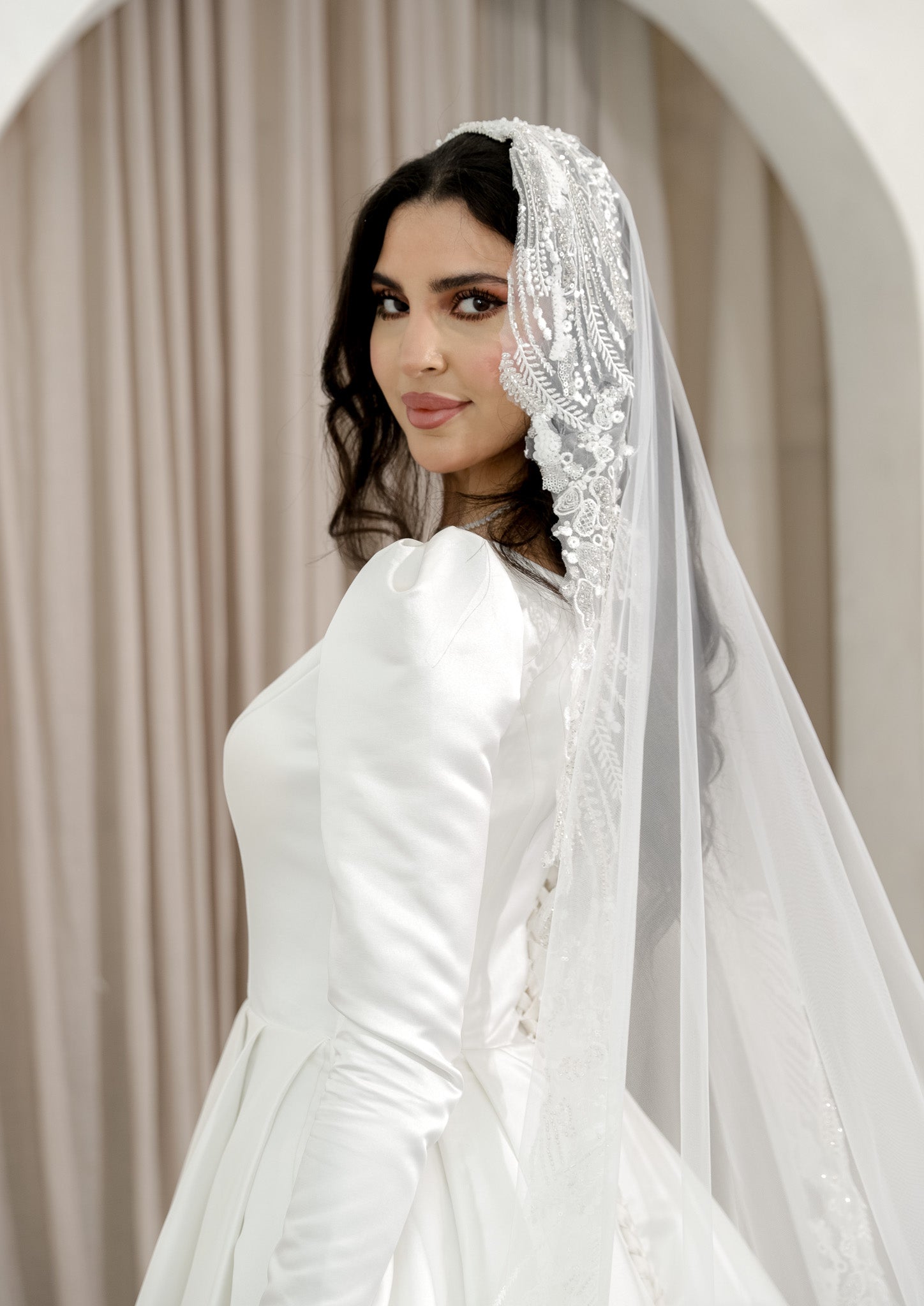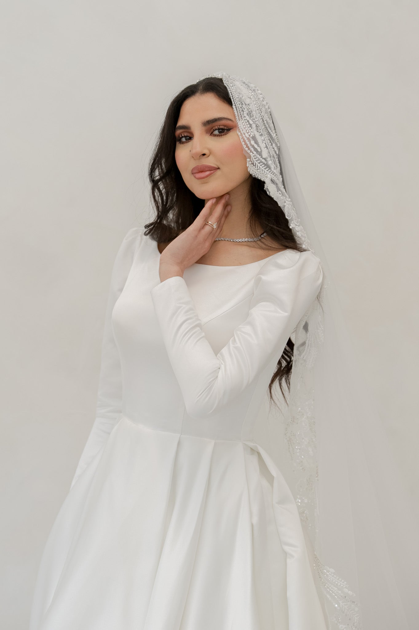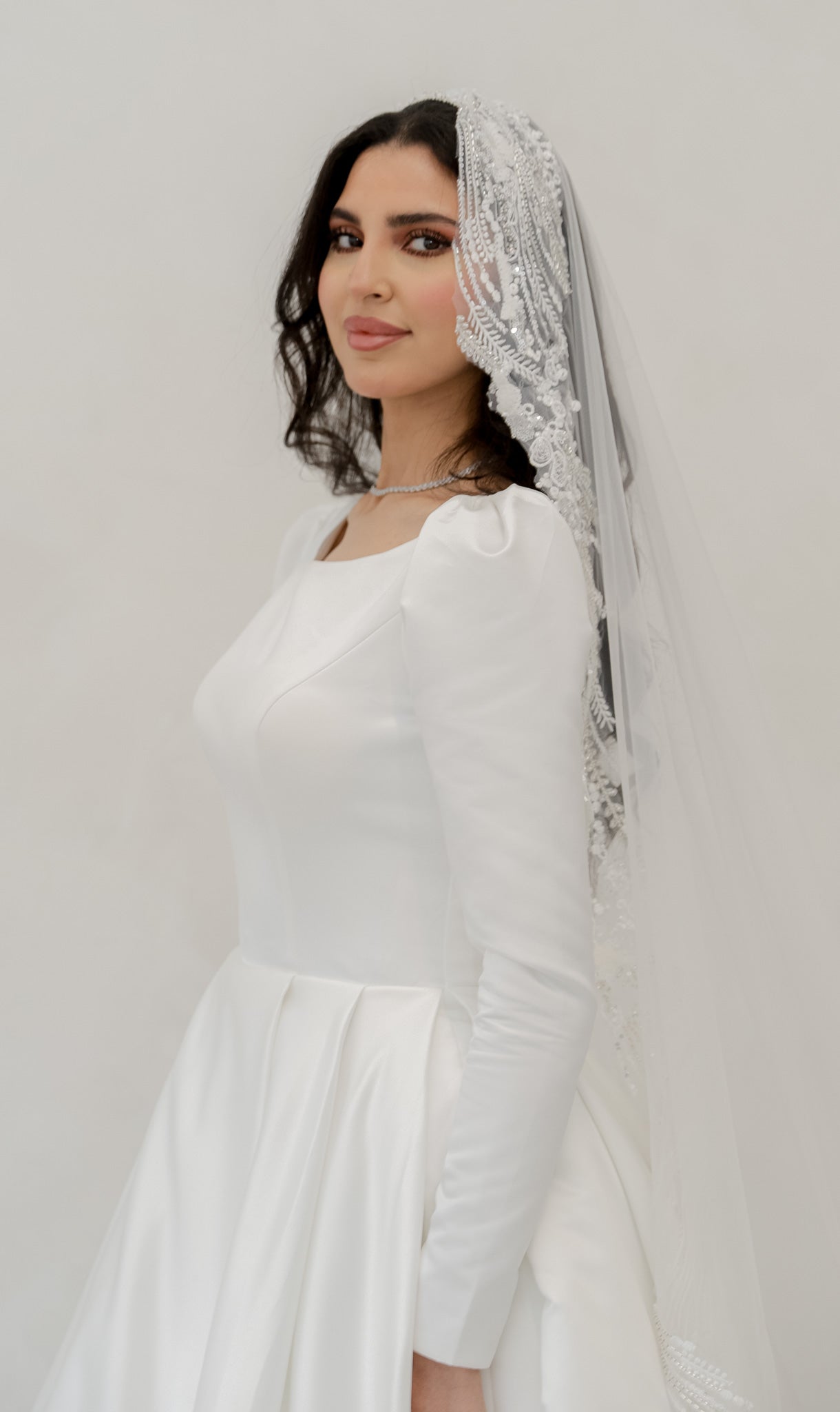 Whether paired with a sleek satin gown or a more ornate bridal dress, the Dina veil adds a refined touch of grandeur. It's the kind of veil that completes a bridal look — effortlessly elegant, yet undeniably special.