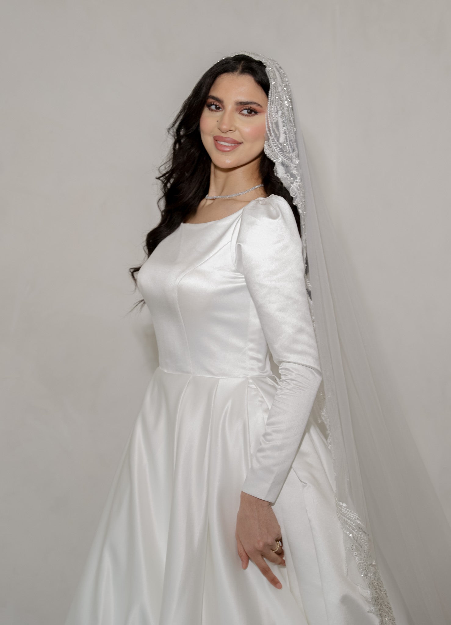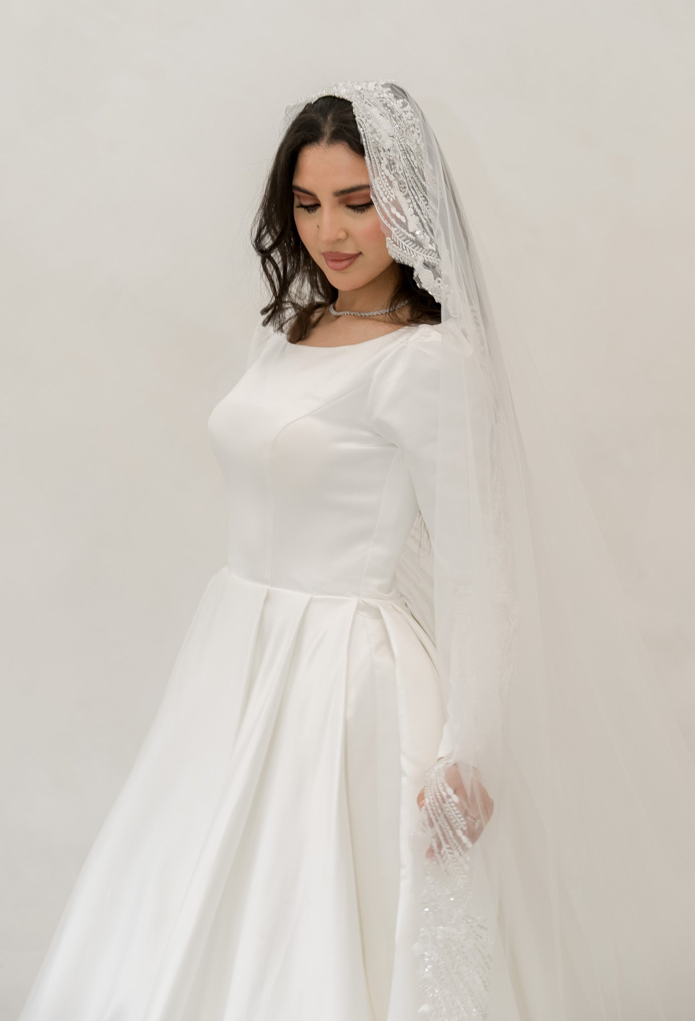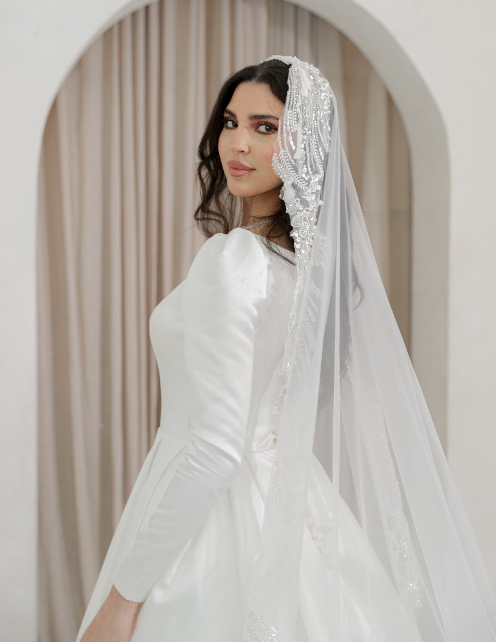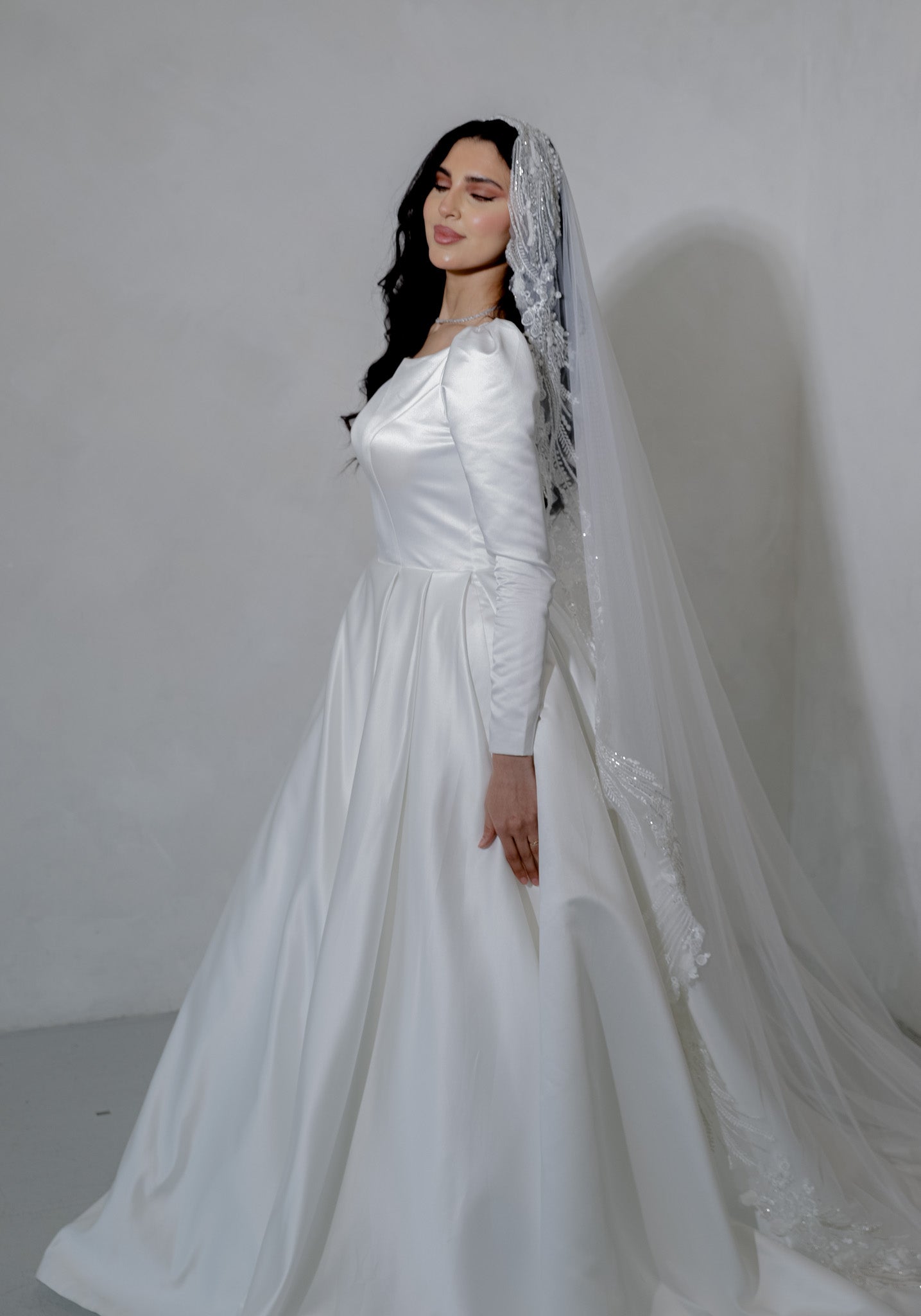 Whether paired with a sleek satin gown or a more ornate bridal dress, the Dina veil adds a refined touch of grandeur. It's the kind of veil that completes a bridal look — effortlessly elegant, yet undeniably special.