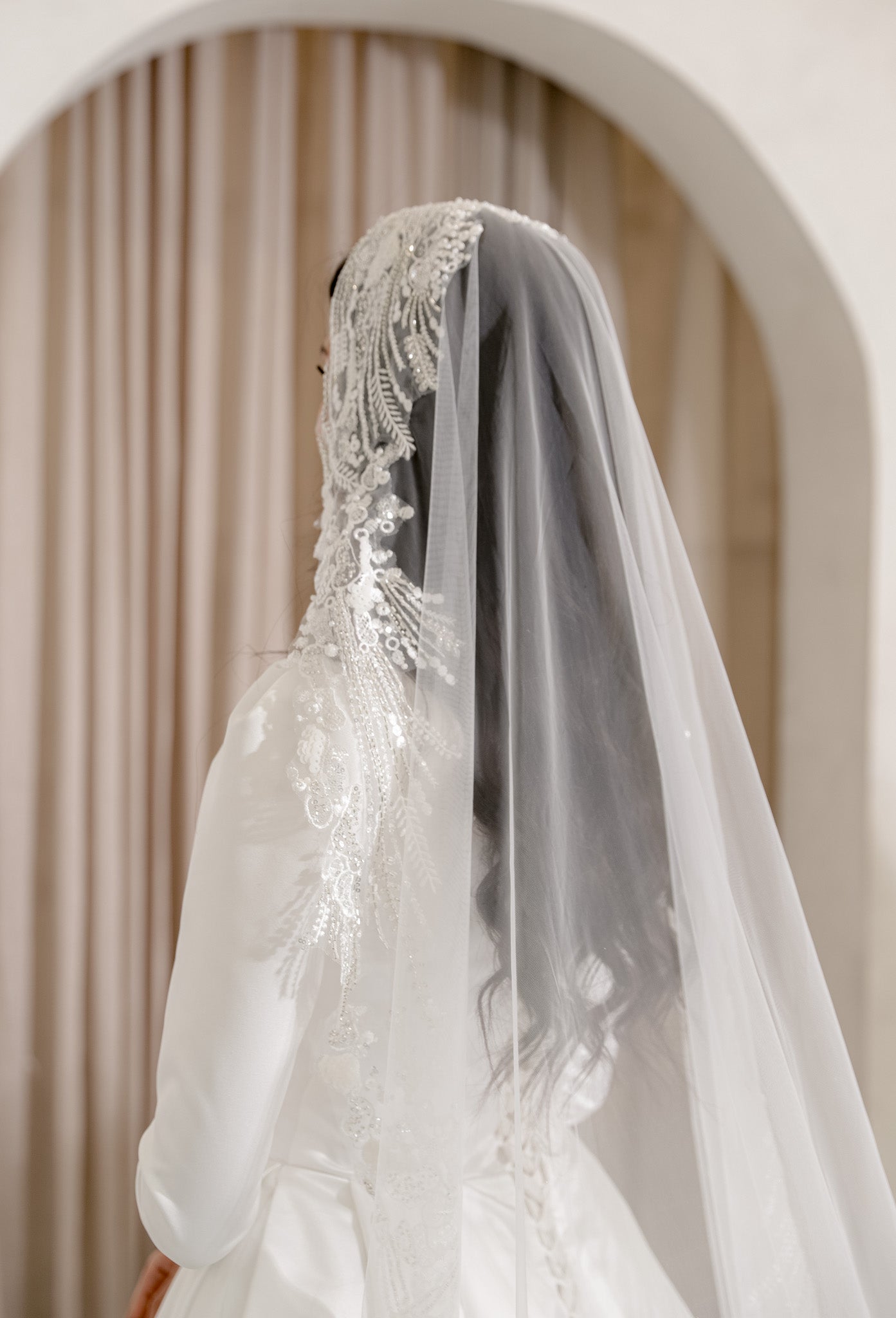 Crafted from soft ivory tulle, the Dina veil drapes effortlessly over the shoulders and back, allowing it to move fluidly as the bride walks. The lacework along the edge subtly sparkles with scattered sequins and pearls, catching the light in the most graceful way without overpowering the look.