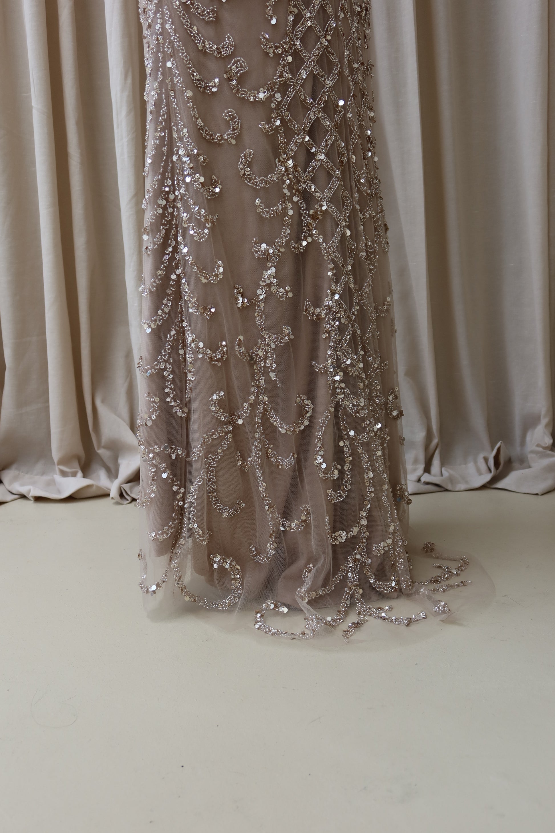 The fitted silhouette highlights the figure before cascading into a graceful floor length finish. The delicate sheer overlay adds depth and fluidity, allowing the embellishments to glisten as if suspended on the skin.