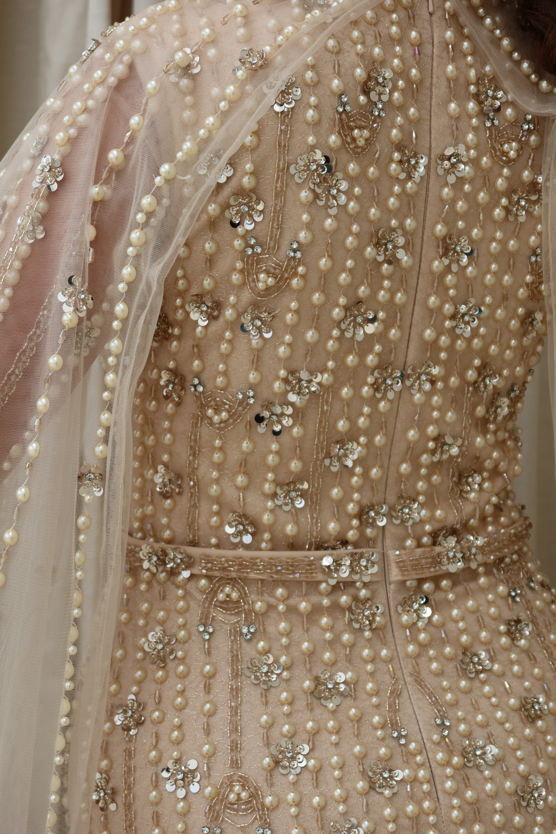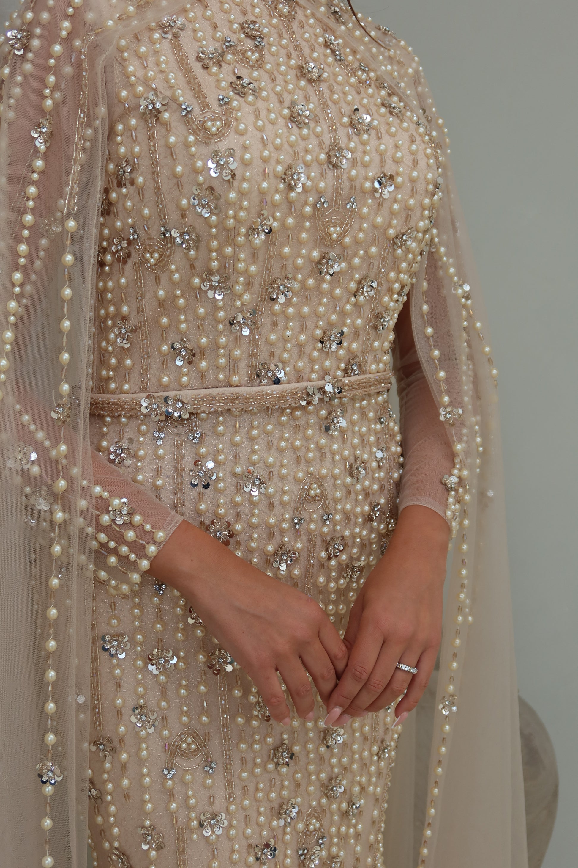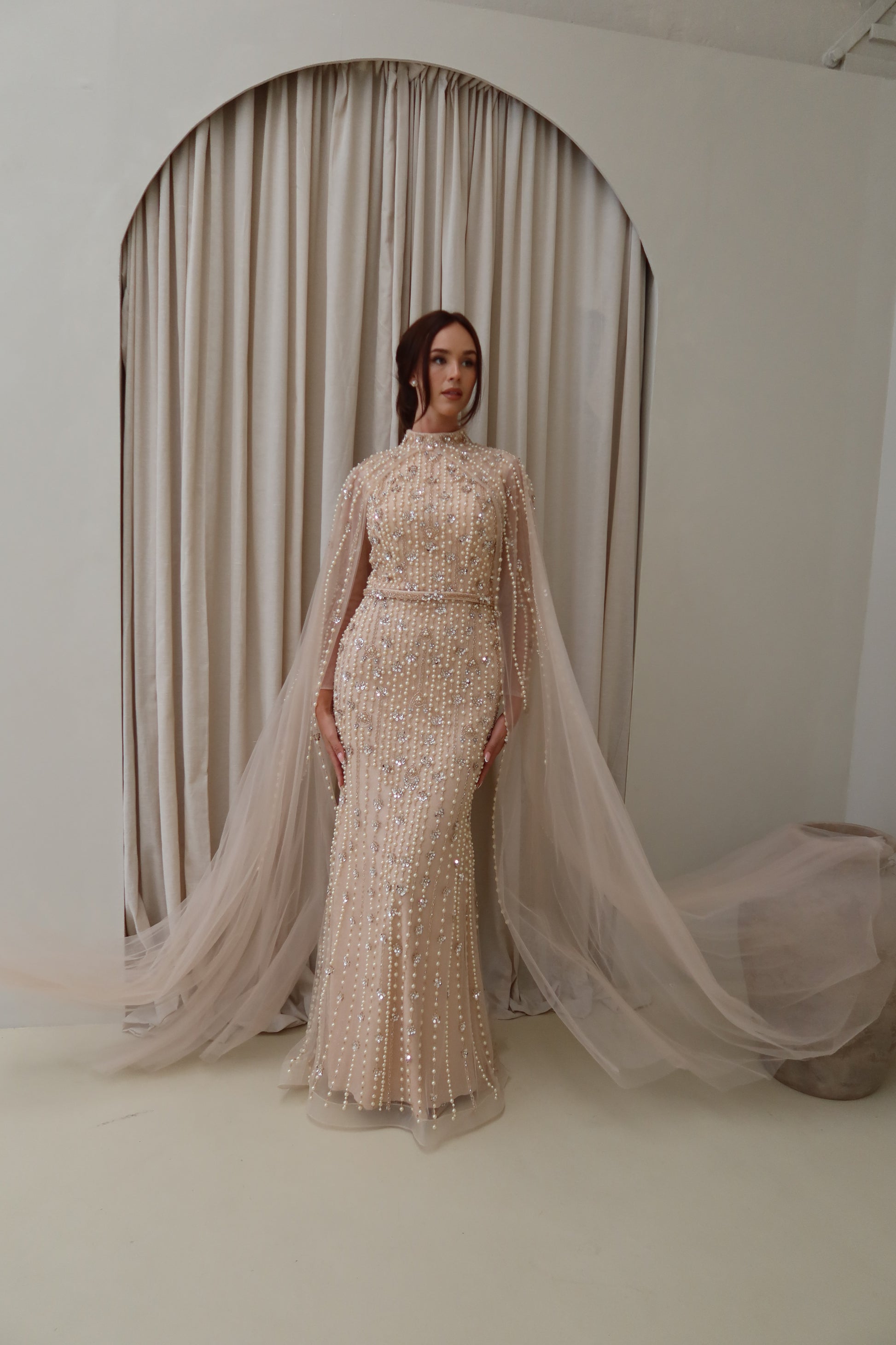 A delicate belt defines the waist, while a sheer cape sweeps over the shoulders, adding movement and a soft sense of drama as it falls to the floor. The sheer fabric contrasts beautifully with the richly detailed beadwork beneath, giving the gown dimension and light.
