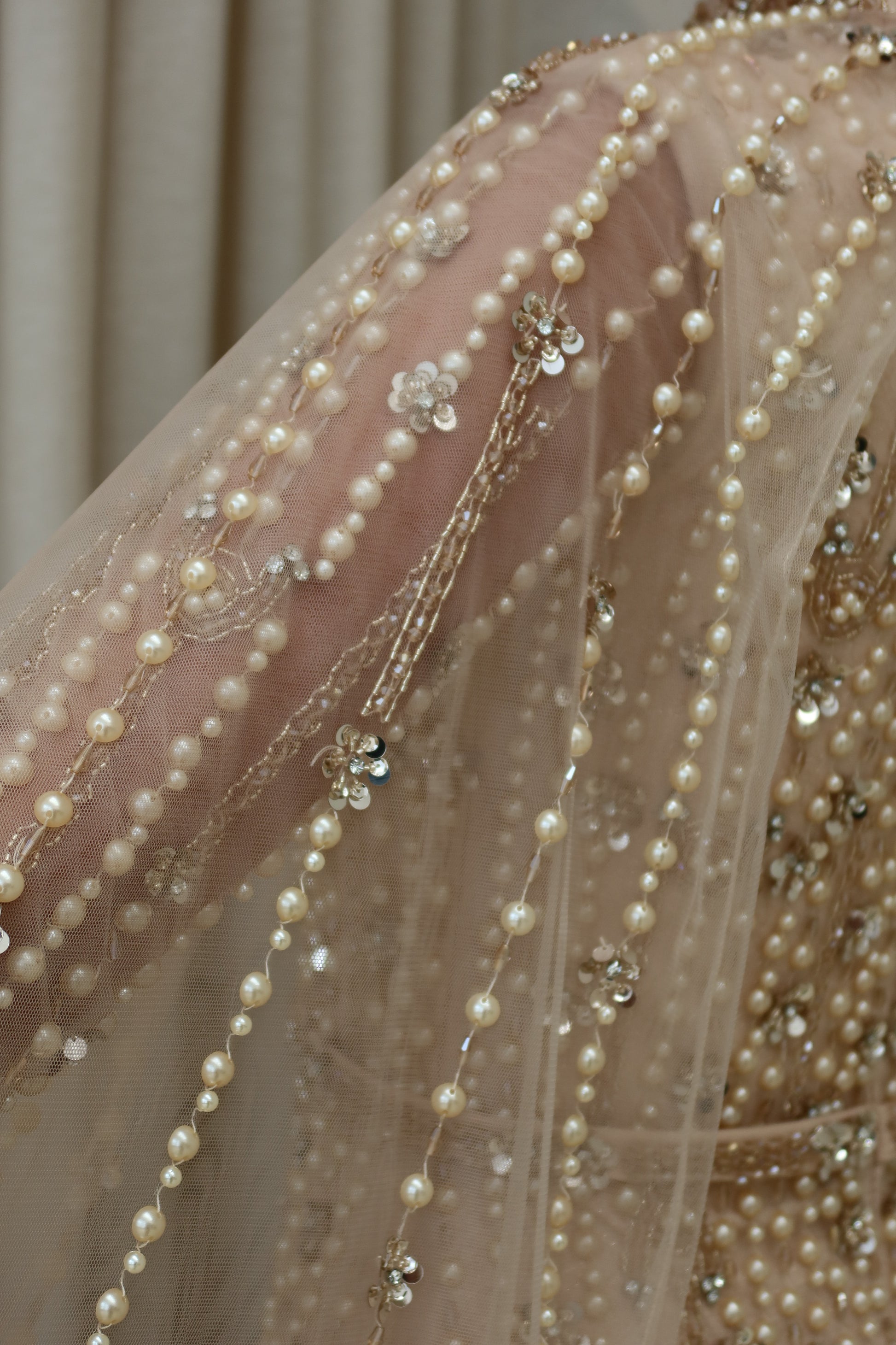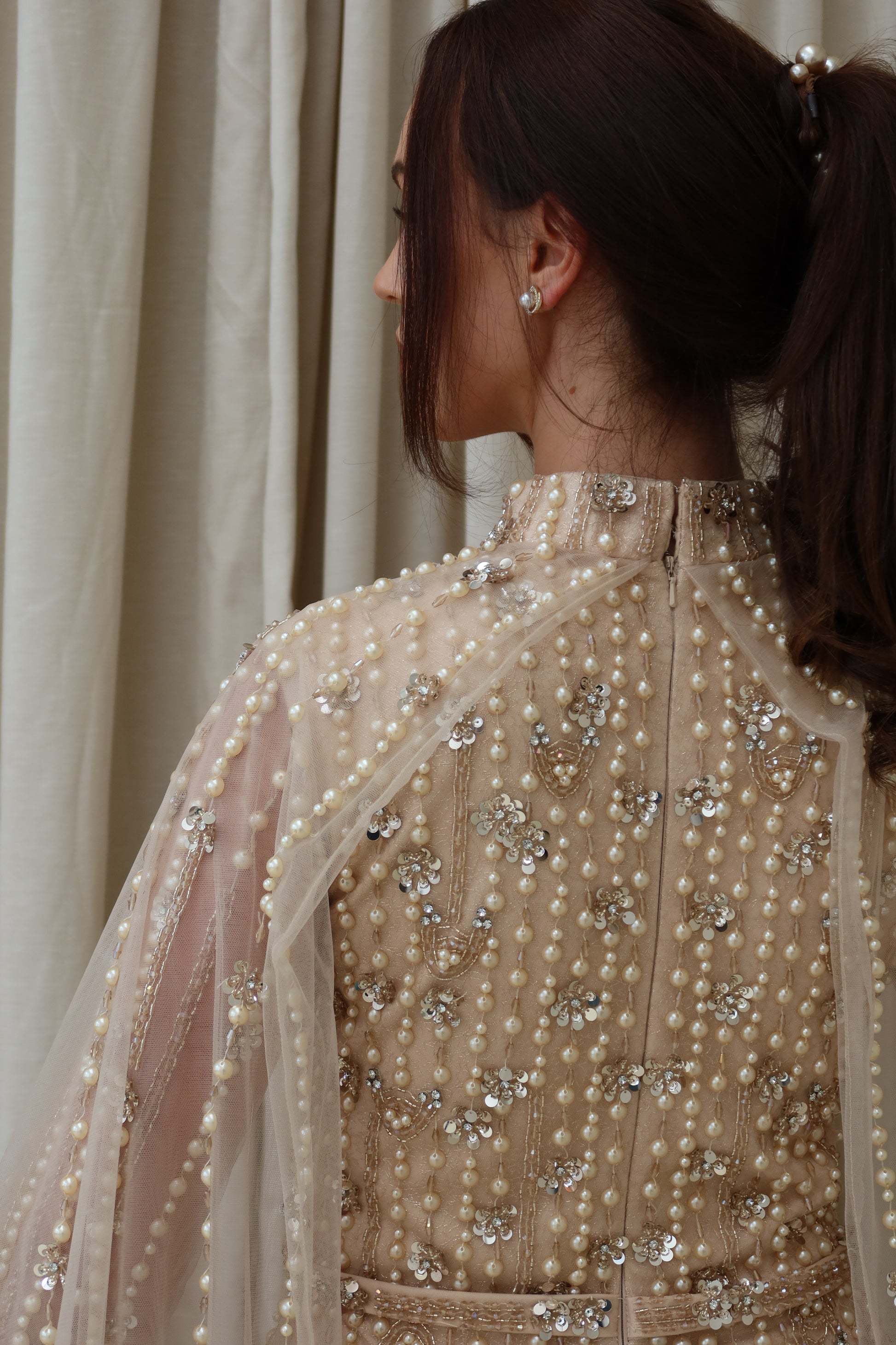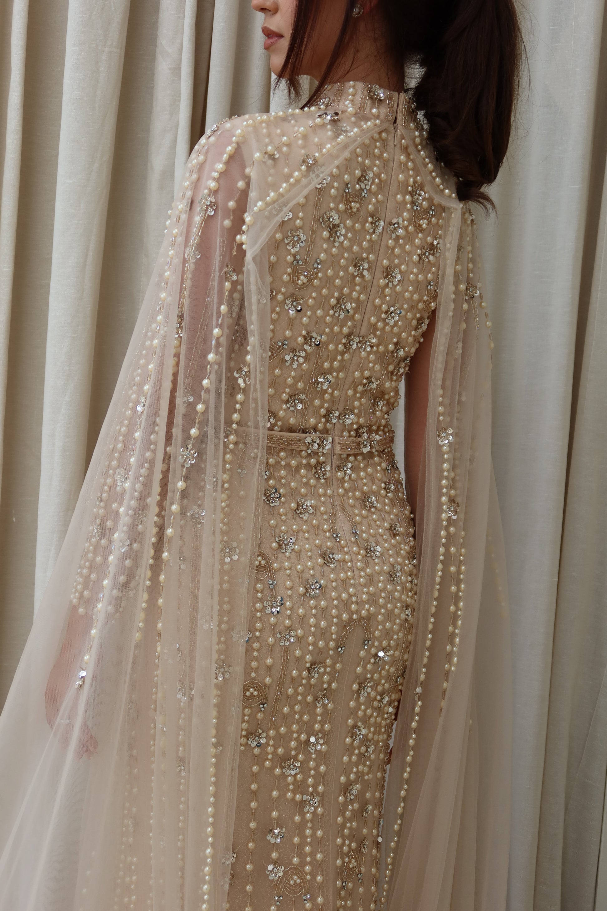 This evening gown is a refined statement piece in a luminous champagne gold tone. Designed with a high neckline and a sleeveless base, the gown is adorned with cascading lines of pearls and crystals arranged in a precise linear design that draws the eye downward, creating height and balance.