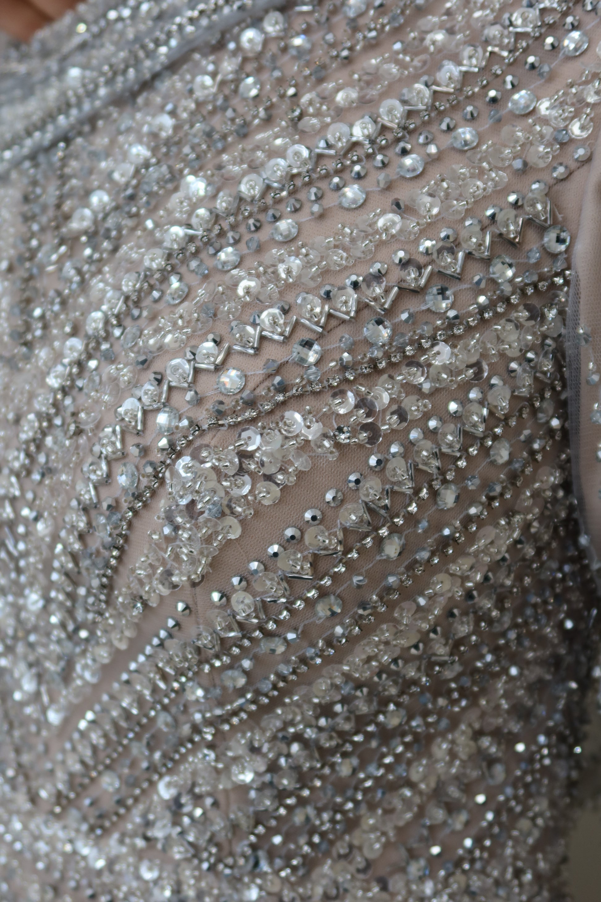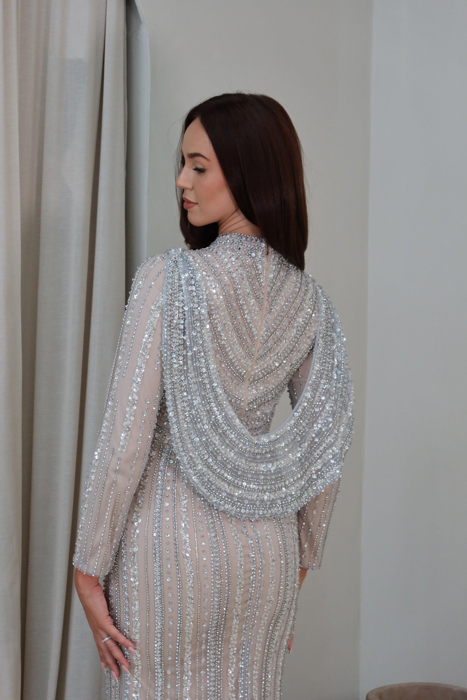 This gown in a nude champagne tone with silver linear beadwork is captivating and captures light with every movement. This fully liend design, has a high neckline and long fitted sleeves, both covered in shimmering bead lines that contour the body. The design follows a mermaid to straight cut, creating a sleek silhouette.