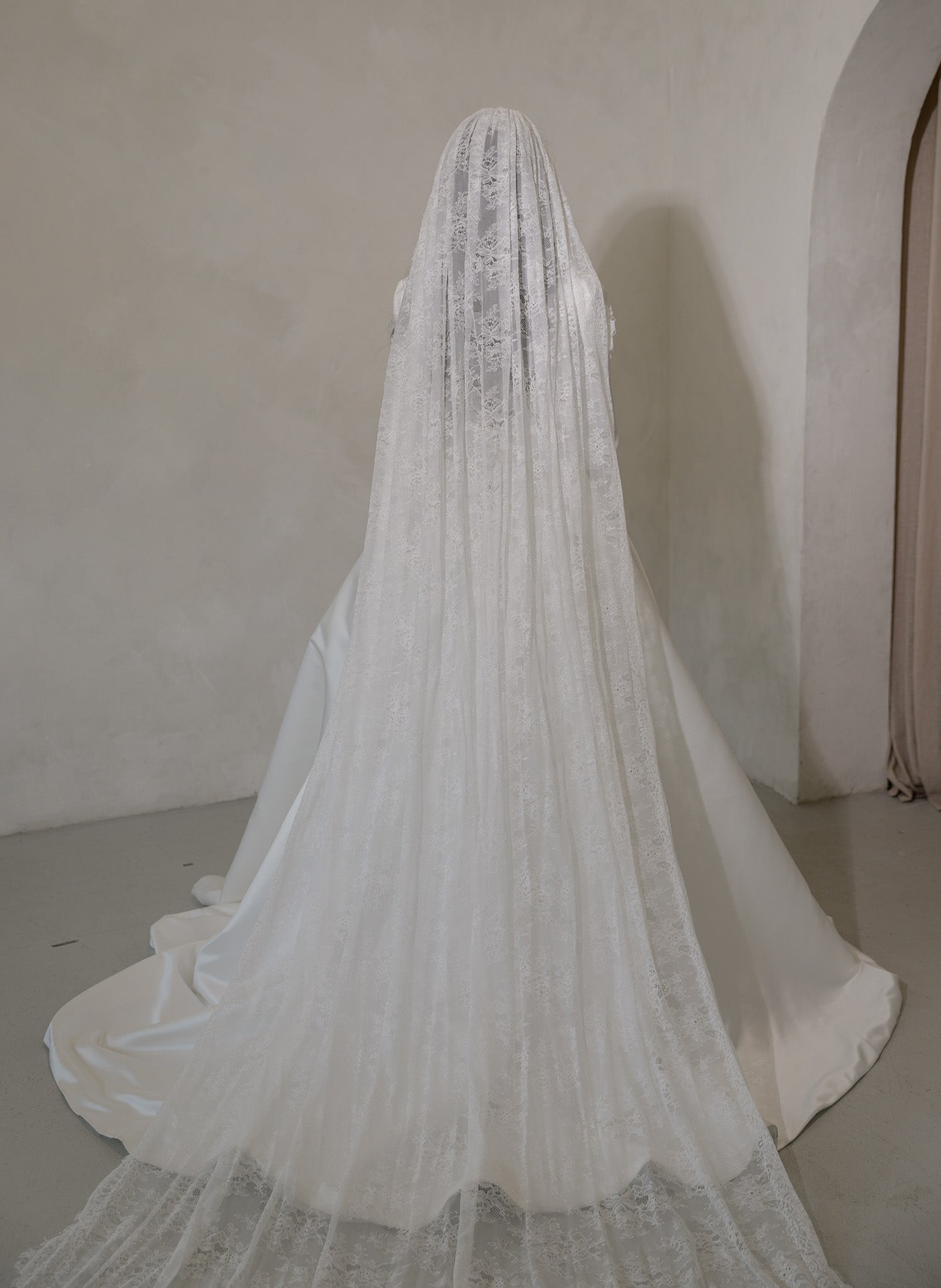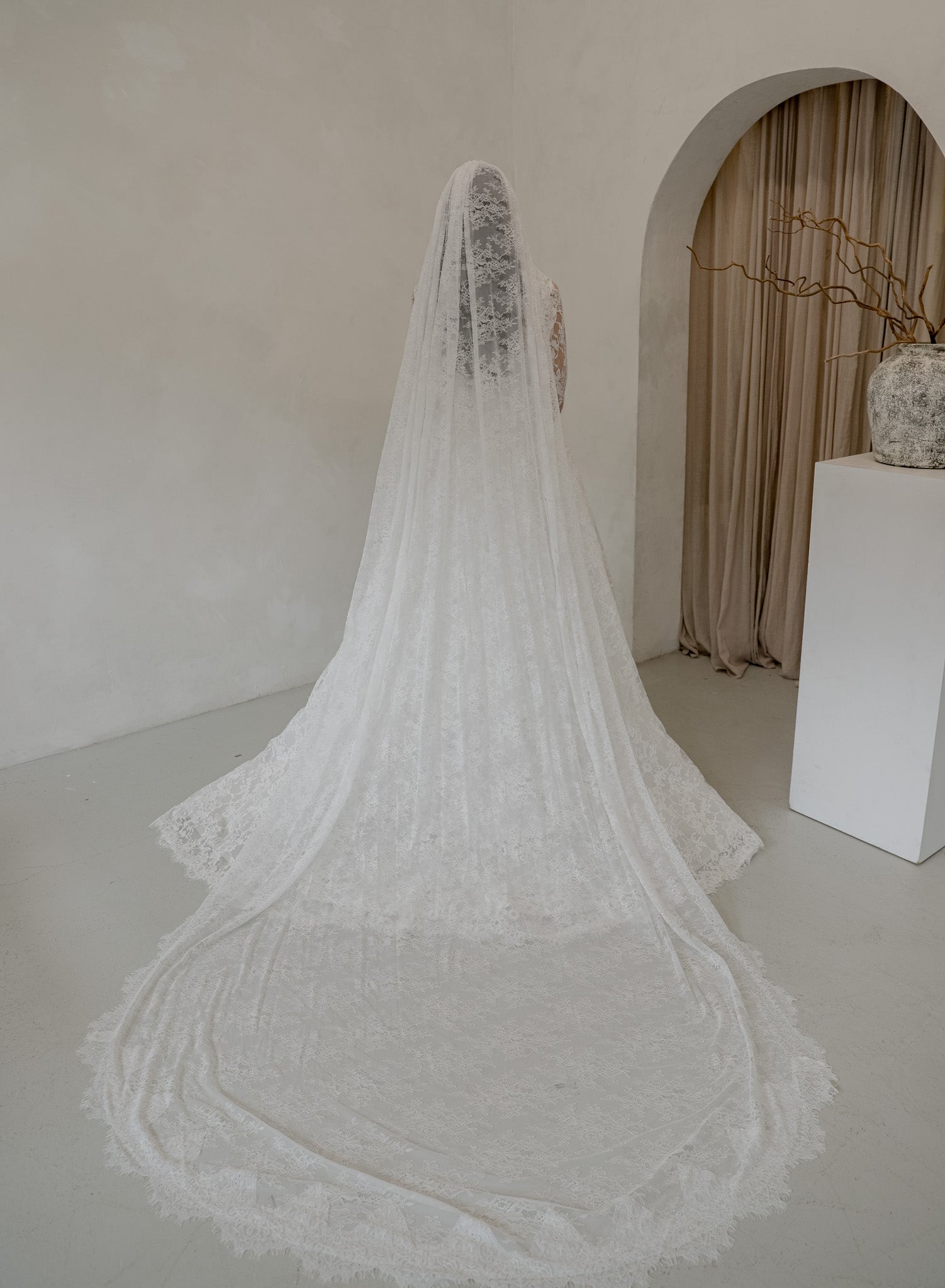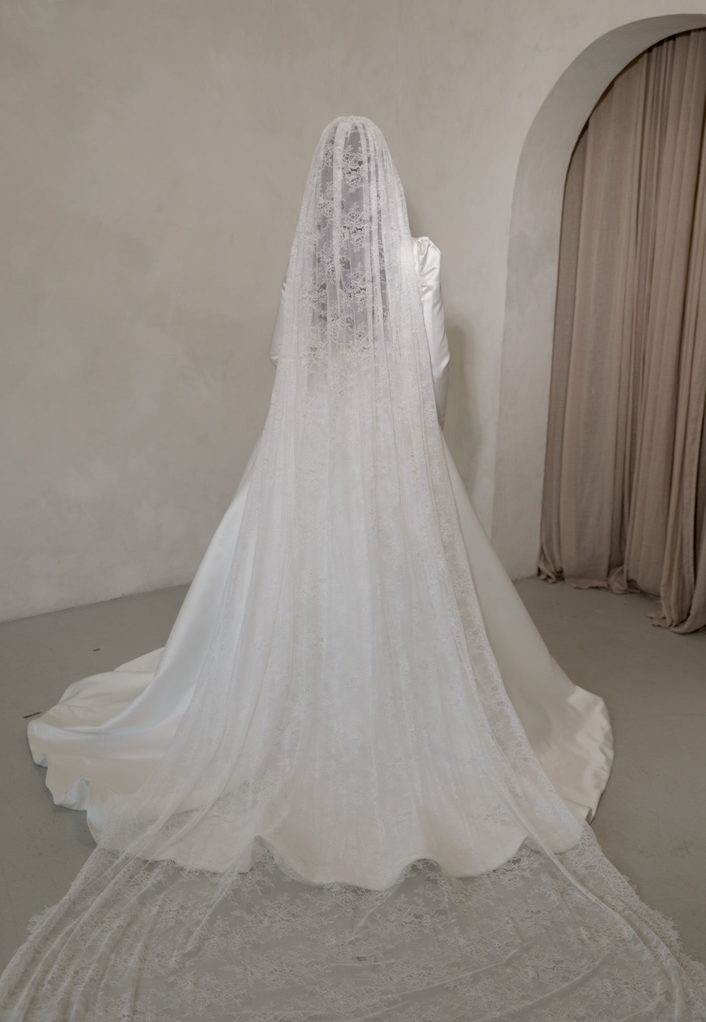 Made from exquisite soft tulle overlaid with delicate Chantilly-style lace, this cathedral-length veil exudes elegance with every inch. The lace is gracefully scattered throughout the body of the veil and finishes with a beautifully scalloped edge that adds depth and drama to the trailing hemline.