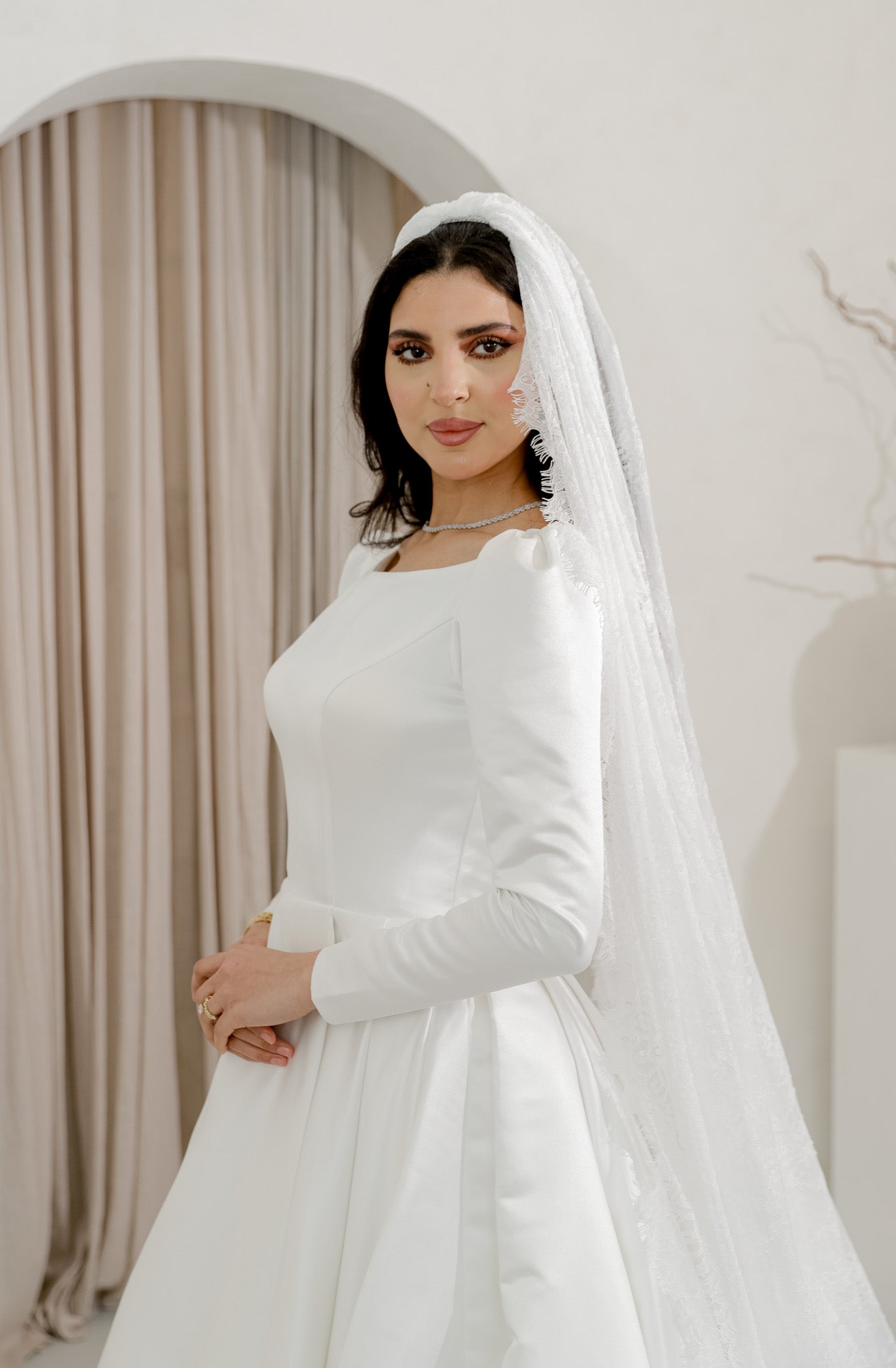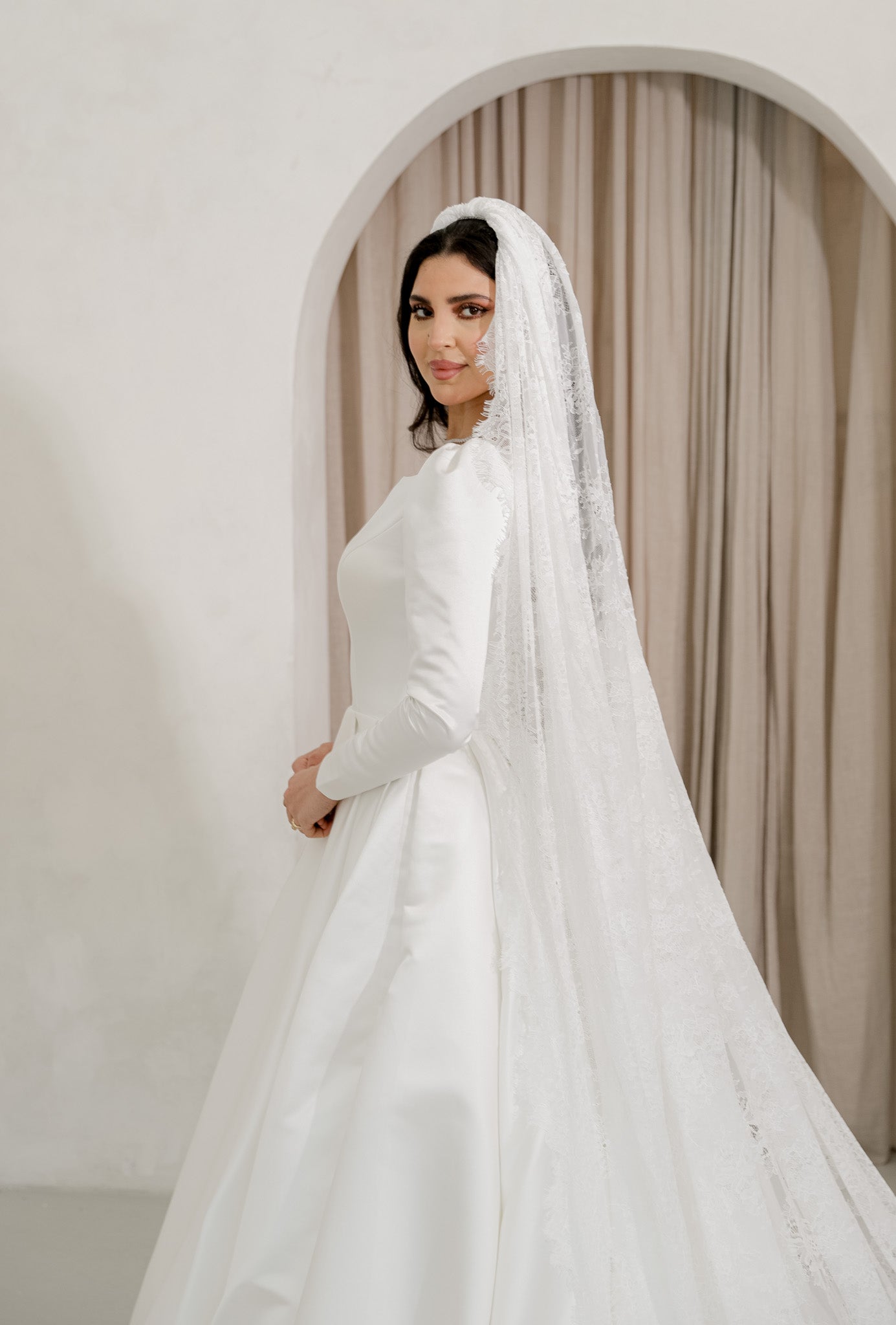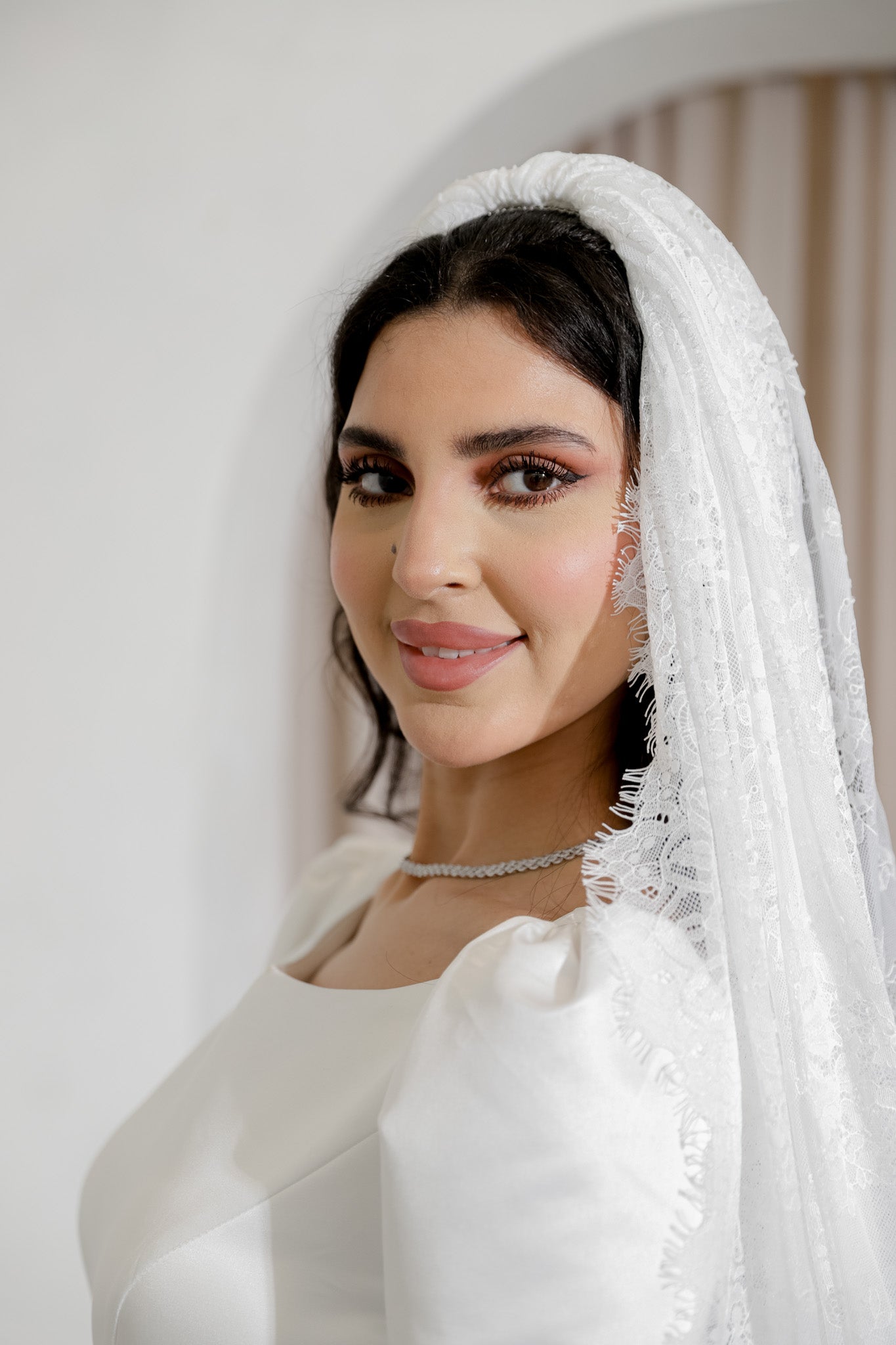 What makes Lacey particularly captivating is the way it envelopes the bride in an almost ethereal softness—subtle yet breathtaking. The intricate floral motifs woven into the lace provide texture and movement, catching the light gently and adding a graceful aura to every step. The wide lace trim frames the face and body without overpowering the gown, making it an ideal pairing for both elaborate and minimal dresses.
