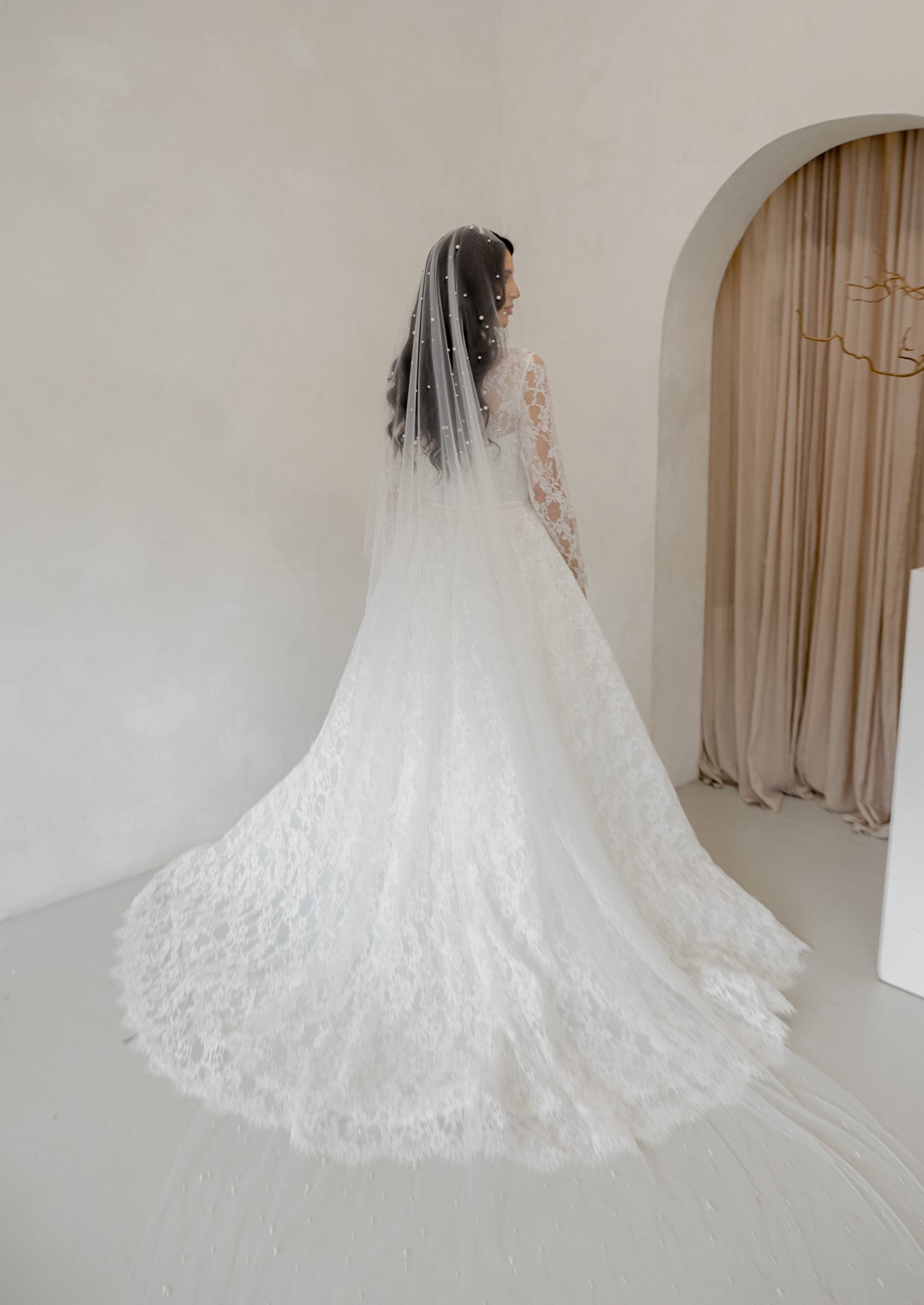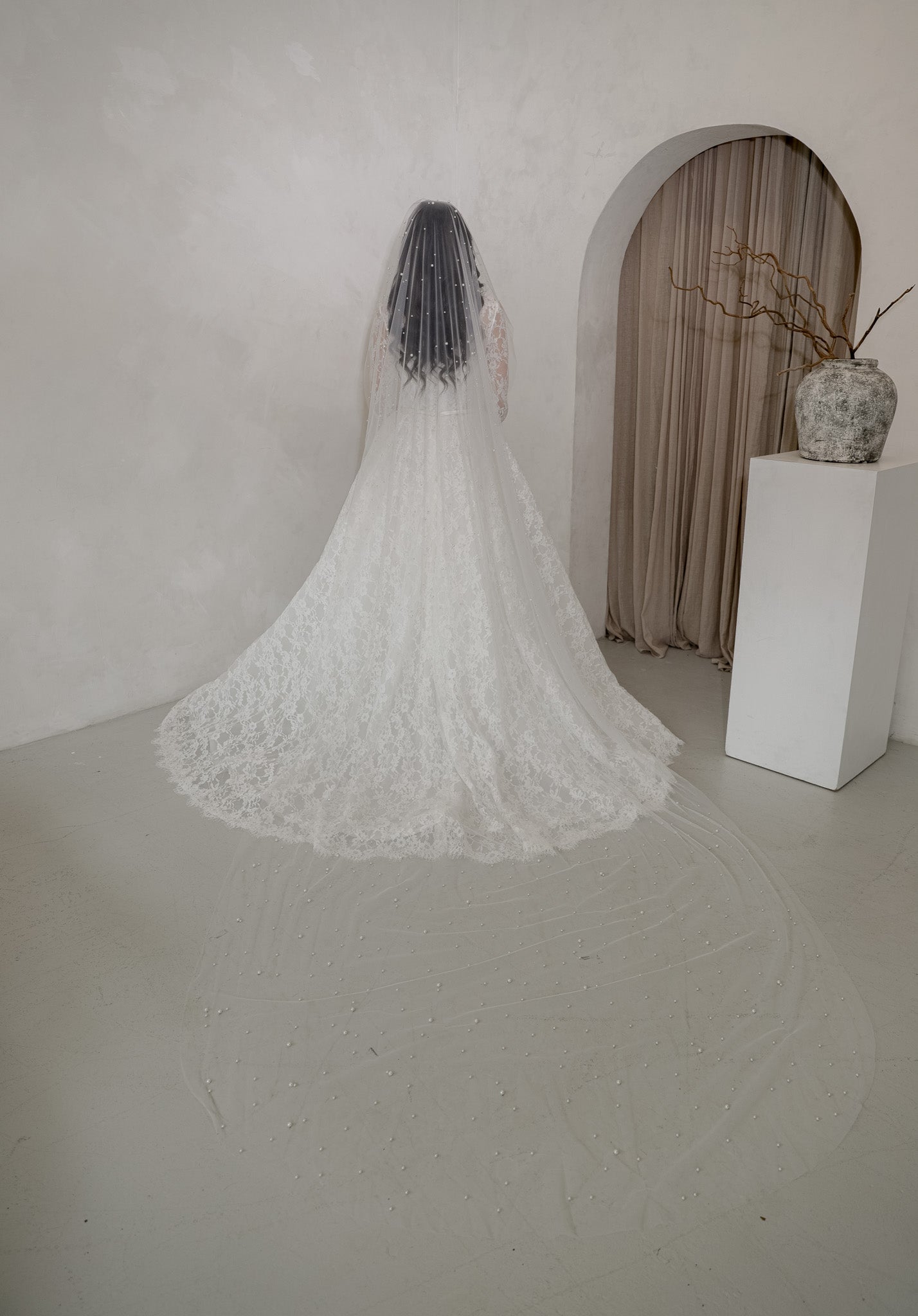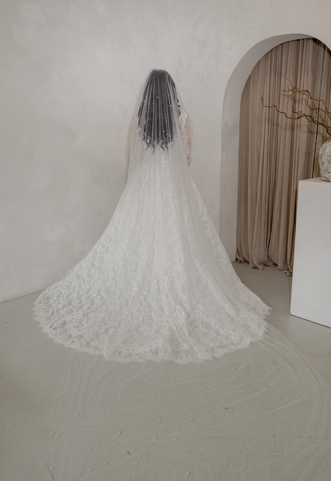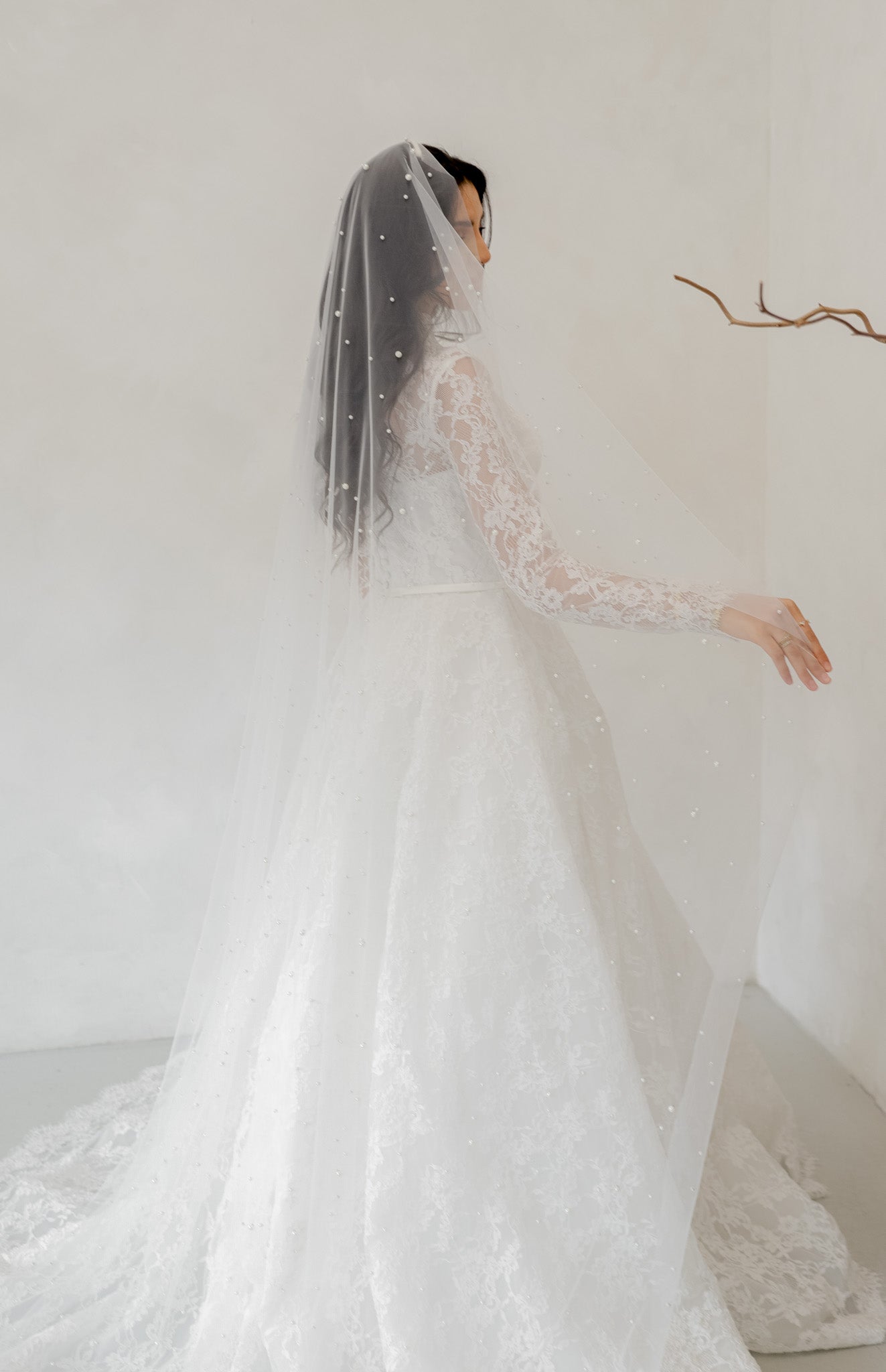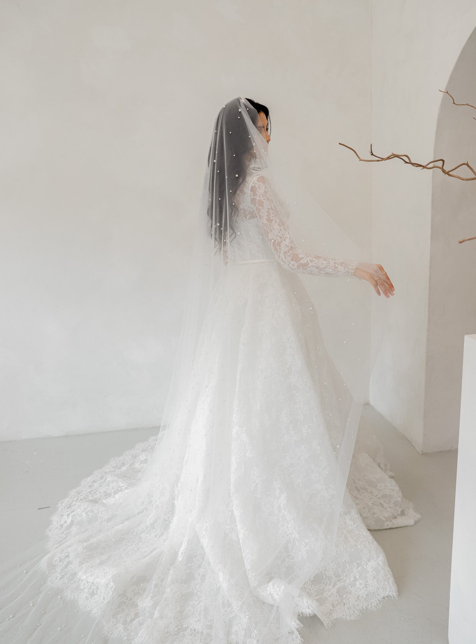 Made from soft, airy tulle, this cathedral-length veil is delicately adorned with pearls that are artfully scattered from crown to hem.